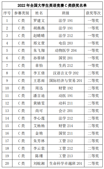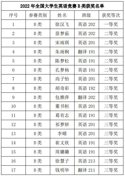 “2022年全国大学生英语竞赛”初赛于5月15日上午在我校举行。本次竞赛共有1329人报名参赛,其中B类206人、C类1123人。在教务处细心指导和外国语学院精心组织下,在阅卷老师客观公正的认真评阅后,严格按照学生成绩和本次竞赛给定获奖比例划定学生获奖名单,并报教务处批准,现公布获奖名单如下: