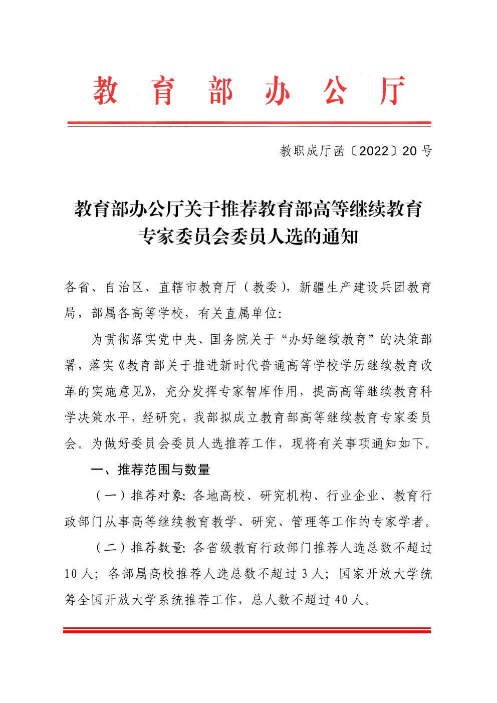 教育部办公厅中国足彩网推荐教育部高等继续教育专家委员会委员人选的通知