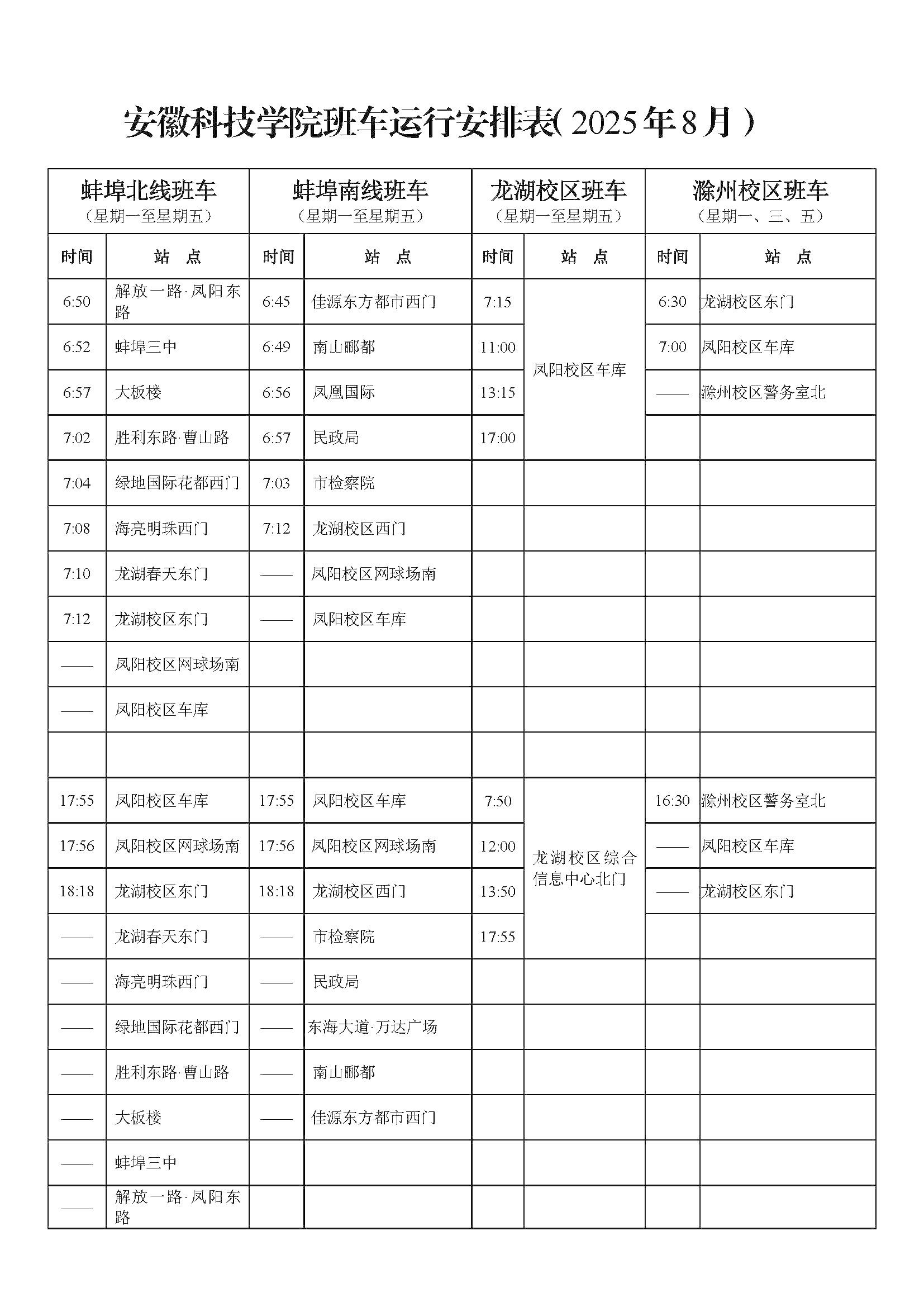 (一)蚌埠南、北线班车各站点按《安徽科技学院班车运行安排表(2025年8月)》早上推迟15分钟发车,晚上提前10分钟发车;