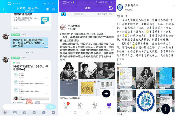 中药学172班、生物工程171、生物制药181、中药学191班等班级通过线上语音介绍雷锋生平事迹与阐述雷锋精神,同学们线上表达自己对雷锋精神的理解,班级官Q和易班微社区打卡等方式纪念雷锋同志。