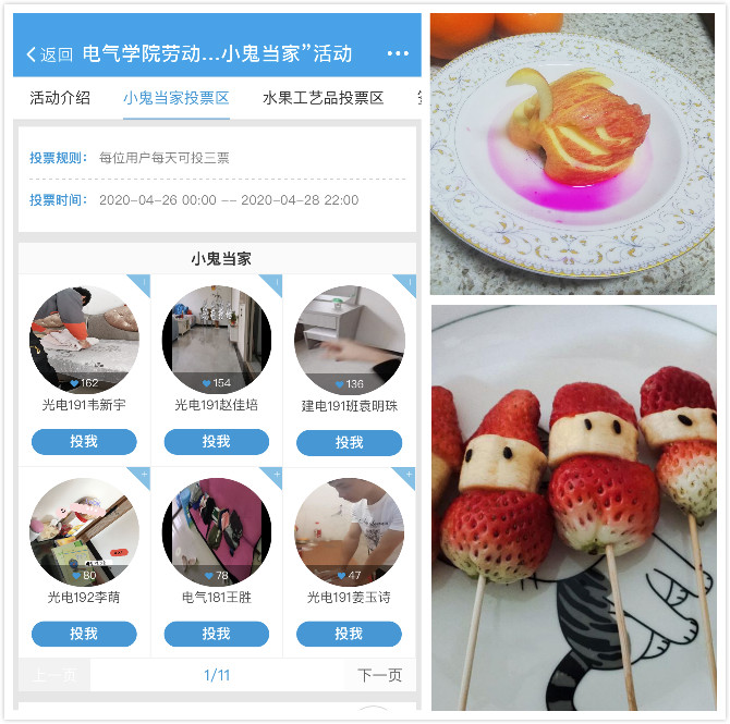 根据电气与电子工程学院《中国足彩网举办第一届“劳动教育”主题月系列活动的通知》(电党字〔2020〕9号)文件要求,继上次举办的社会劳动之后,4月18日至28日,学院组织学生参加一次家庭劳动。本次活动主要分两部分进行,包括“小鬼当家”和“水果工艺品大赛”。活动的宣传和评选在易班进行。