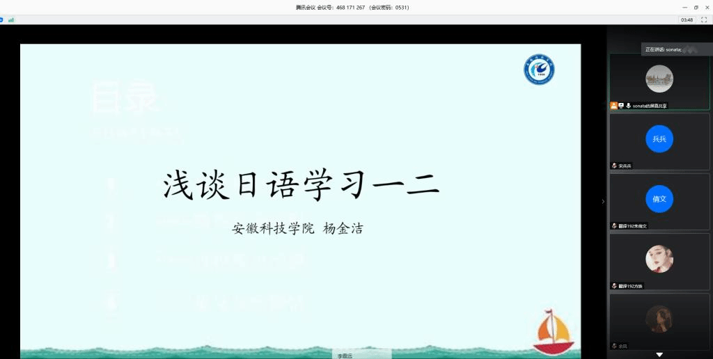 为进一步丰富外国语学院学生校园文化生活,拓宽学生对日本文化的了解和认识的知识面,领略日本的风情,诠释日语之魅力。外国语学院于5月31日晚上利用腾讯会议举行“英博杯”安徽科技学院第十一届外语文化节之日本风情讲座。本次讲座邀请外国语学院杨金洁老师担任主讲人,外国语学院18级全体学生和部分19级学生到会聆听,外国语学院专职辅导员宋兵兵主持本次讲座。
