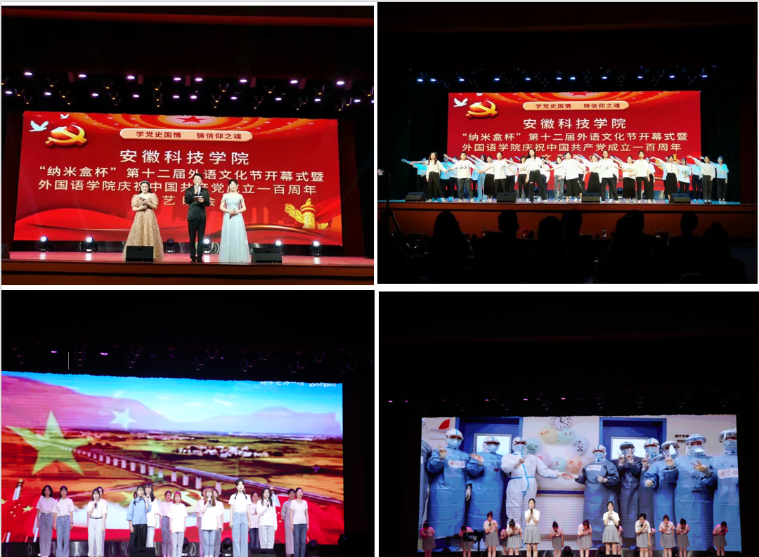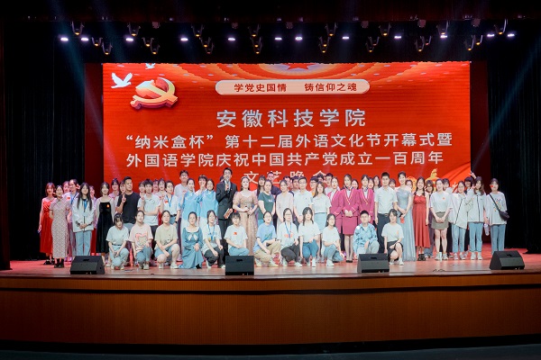 5月30日晚,安徽科技学院“纳米盒杯”第十二届外语文化节开幕式暨庆祝中国共产党成立一百周年文艺晚会在大学生活动中心举行。校党委委员、宣传(统战)部部长卫胜,国际交流与合作处处长、港澳台事务办公室主任刘东楼,教务处处长、创新创业学院院长俞浩,党委学工部部长、学生处处长何永勇,校团委书记黄立义,招生与就业工作处副处长、招生办公室副主任、校友工作办公室主任何晓冬,外国语学院院长陈德用、党委书记蔡为青、副院长刘萍、党委副书记张海亮出席开幕式。开幕式由蔡为青主持。
