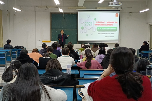 11月19日下午,应人文学院邀请,蚌埠市禹会区法院刑庭庭长、一级法官,禹会区监察委员会特邀监察员王瑞青在新知楼B座102教室为法学专业学生作题为“‘以审判为中心’的司法制度下如何构建共赢的公正量刑格局——控、辩、审三方依法合理开展量刑规范化”的学术报告。学术报告由人文学院法学系主任张晓云主持,法学专业2019级学生参加。