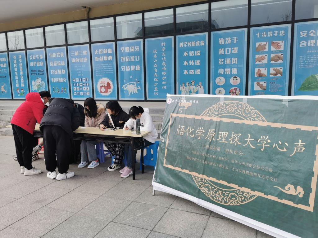 为丰富校园文化生活,普及心理健康知识,促进大学生全面协调发展,化学与材料工程学院于12月开展了“12 15心理健康活动周”系列活动。本次心理健康活动周的主题是“悟化学原理,探大学心声”,分线下“摆点”、寝室走访以及线上知识竞赛三个部分。