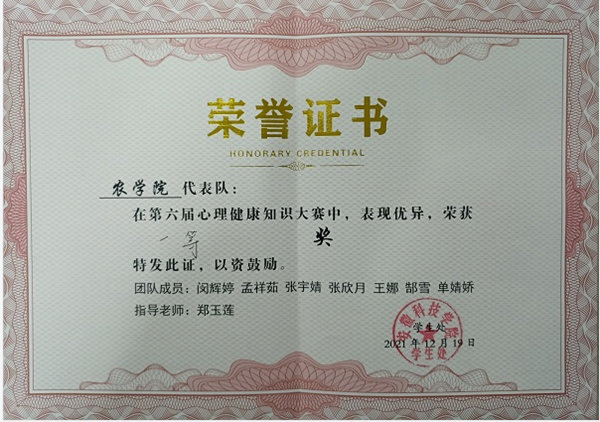 12月19日下午,由学生处主办的校第六届心理健康知识竞赛圆满落幕。经过激烈角逐,农学院代表队从参赛的14支代表队中脱颖而出,荣获一等奖的好成绩。