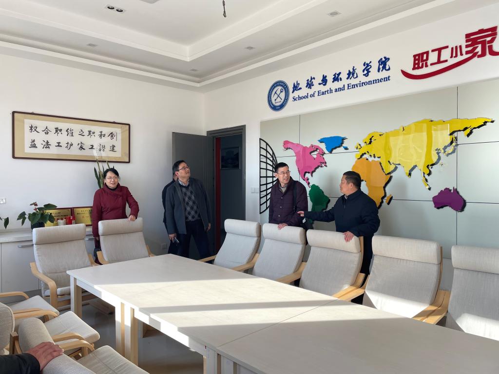 在安徽理工大学校工会主席娄志勇、副主席陈忠琴的陪同下,考察组一行先后参观了地球与环境学院、测绘学院的职工之家,现场体验了两个学院职工之家的健身、休闲、学习场地和娱乐设施,听取了学院工会负责人在职工之家建设方面的经验介绍。