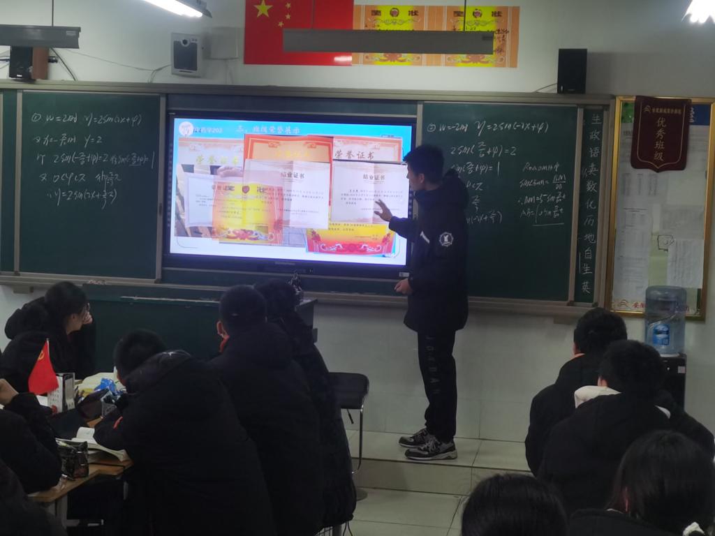 随后,实践团成员跟随老师到部分班级开展学校宣传介绍、发放宣传册,通过“我与安科的故事”向同学们介绍了安徽科技学院的学习氛围、学校条件、历史渊源、校园风景、师资队伍、考研录取率等相关情况。随后与老师们一同张贴喜报,向母校报喜。