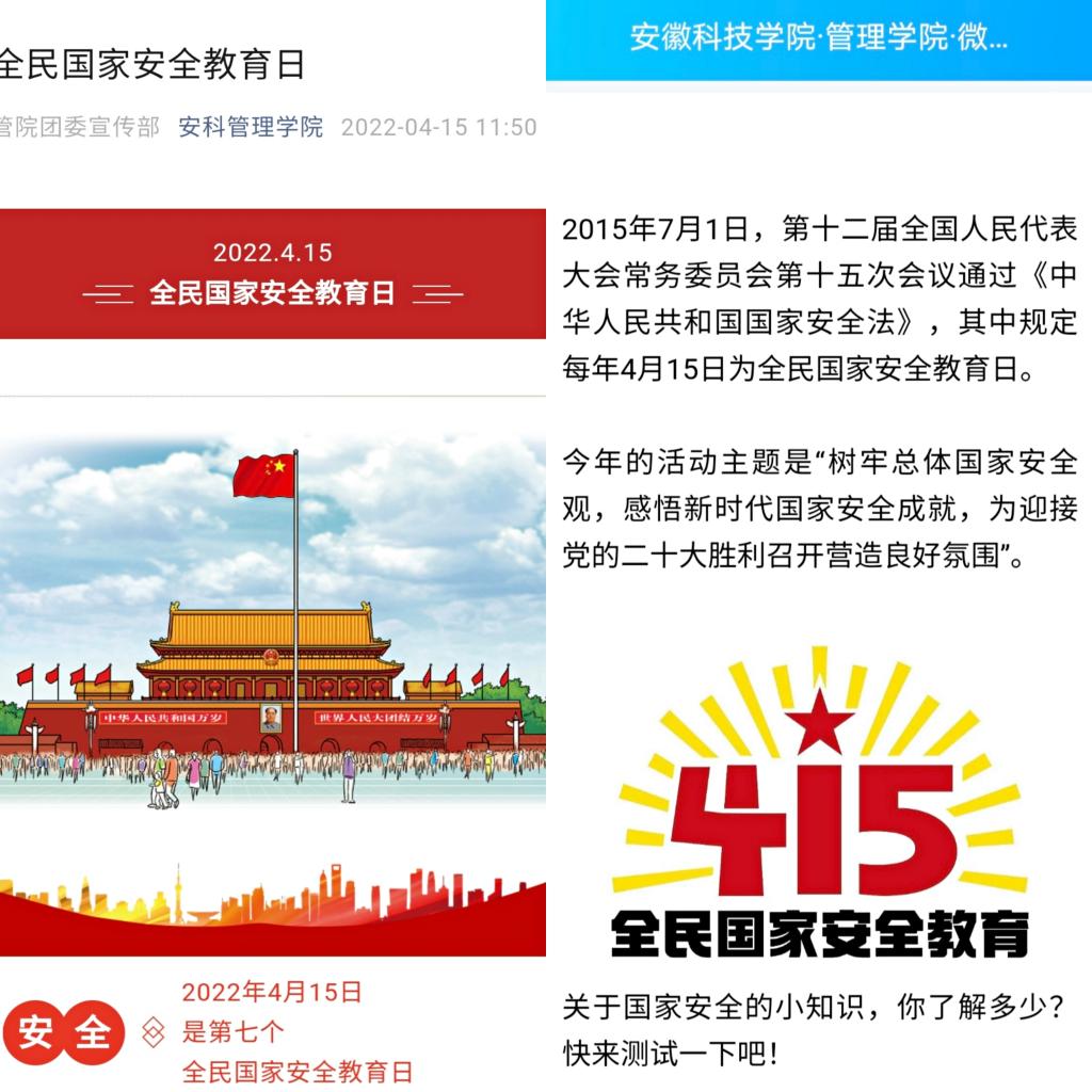为宣传普及国家安全教育知识,增强全体学生国家安全意识,在第七个全民国家安全教育日来临之际,管理学院围绕今年的活动主题“树牢总体国家安全观,感悟新时代国家安全成就,为迎接党的二十大胜利召开营造良好氛围”,认真开展了2022年全民国家安全教育日主题教育系列活动。