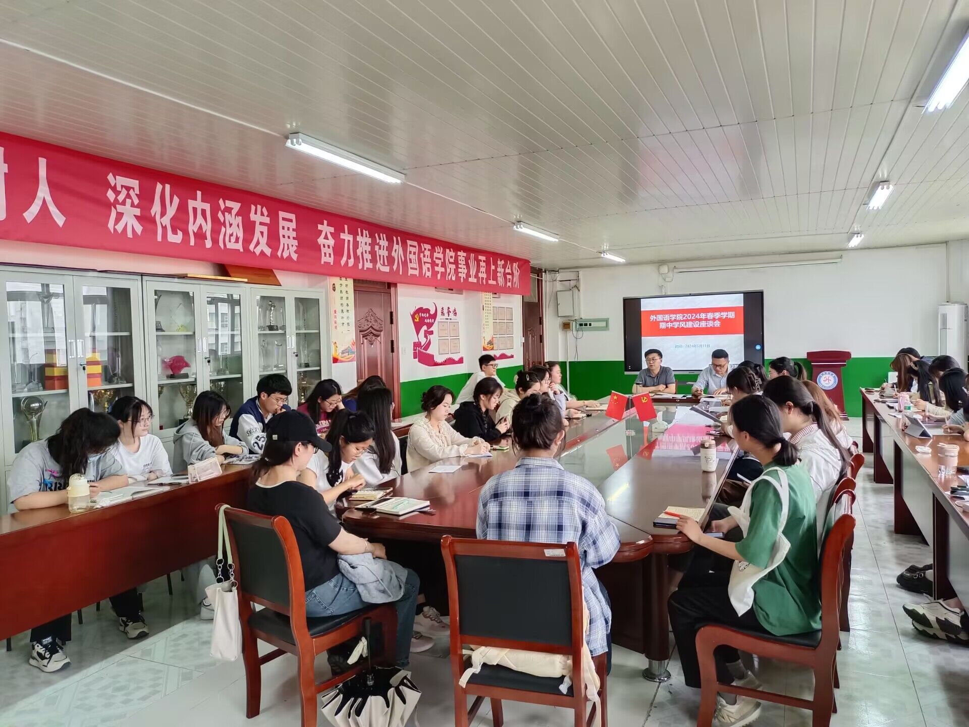 为进一步加强学风建设,提高学生的学习自觉性、积极性和主动性,5月11日下午,外国语学院在学院会议室召开2024年春季学期期中学风建设座谈会。学院相关领导和全体辅导员出席会议,学生会、各班级主要学生干部参加会议。会议由学院党委副书记张海亮主持。