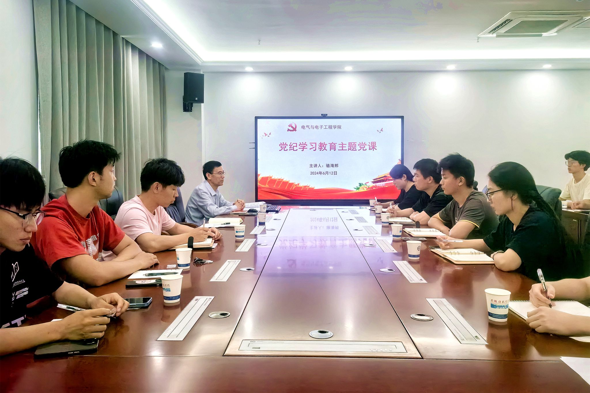 为推动党纪学习教育走深走实,6月12日下午,电气与电子工程学院在西辅楼317会议室开展党纪学习教育专题党课。党课由学院党委书记骆海邦主讲,学院组织员张深主持。学院学生党员代表和部分入党积极分子参加活动。