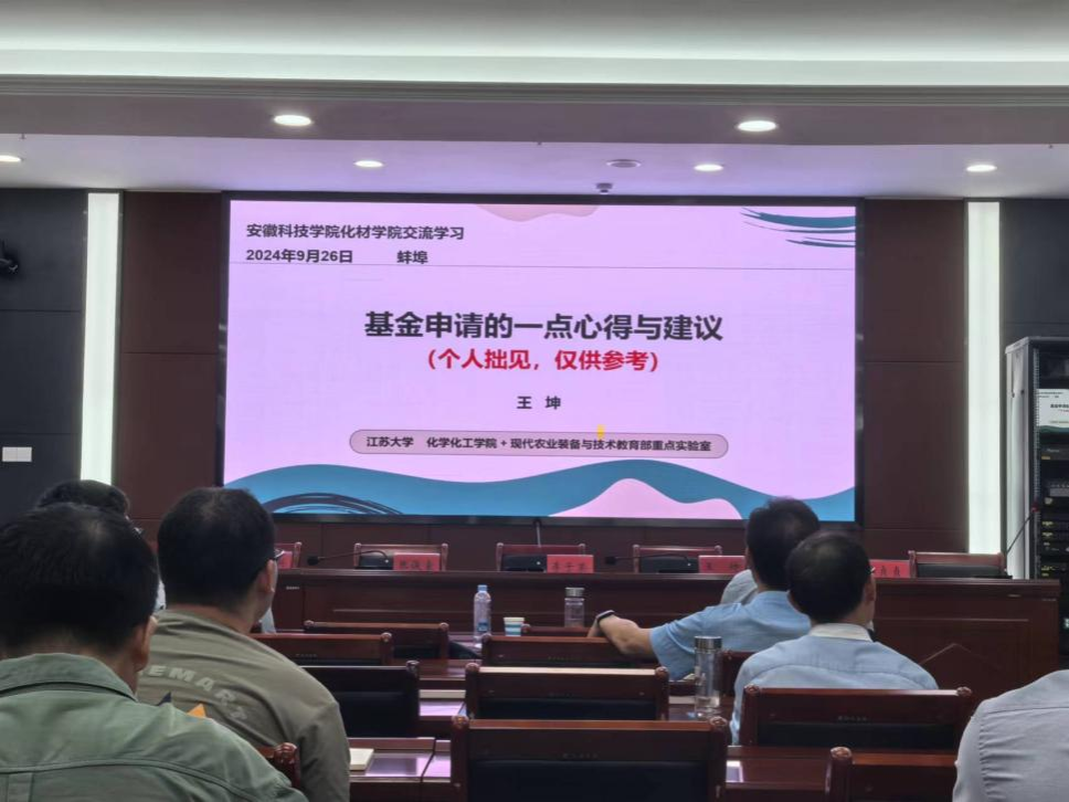 9月26日下午,化学与材料工程学院邀请江苏省“青蓝工程”中青年学术带头人王坤教授、江苏科技大学环境与化学工程学院副院长张俊豪教授及江苏大学化学化工学院副院长朱国兴教授为学院师生作学术报告和国家自然科学基金申报指导讲座。会议由副院长惠贞贞副教授主持,学院青年教师和部分本科生参加本次讲座。