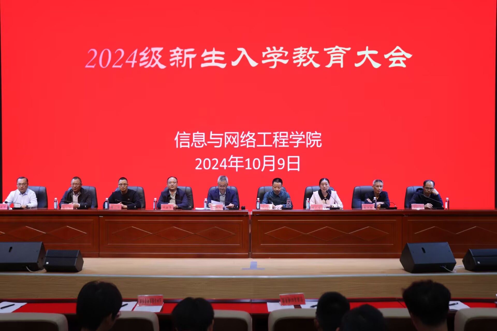 10月9日中午,信息与网络工程学院在信息中心东辅楼二楼报告厅召开2024级新生入学教育大会。学院党政领导、各系室主任、教师代表、全体辅导员及2024级全体新生参加会议。会议由学院党委副书记韦乃学主持。