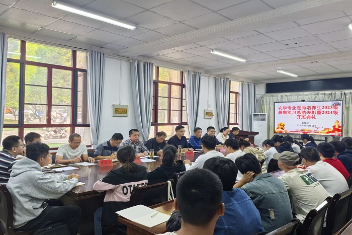 10月15日下午,农学院举行农学(农技推广)专业2023级暑期实习总结表彰暨2024级开班典礼。教务处副处长(主持工作)舒英杰、凤阳县农技推广中心主任徐德明、农学院党政领导、定向就业县(区)农业农村局联系人、校内外指导老师,2023级、2024级农学专业(农技推广)参加会议。会议由农学院院长崔广荣主持。