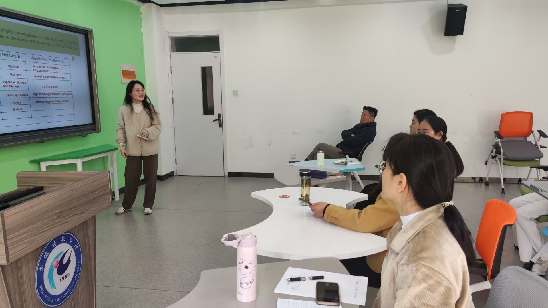 孙玉梅与全体老师分享了题为“赠送礼物”的教学设计,她首先提出了语言目标、教学目标、批评思维、文化意识等相关的教学目标,接着陈述了教学过程中的教学方法、教学活动、教学意图。教研室教师认真观摩,踊跃发言,认为孙老师的教学设计目标明确、步骤清晰、衔接流畅、方法得当,并就课件色彩、呈现方式、内容详略等诸多细节提出了修改意见。