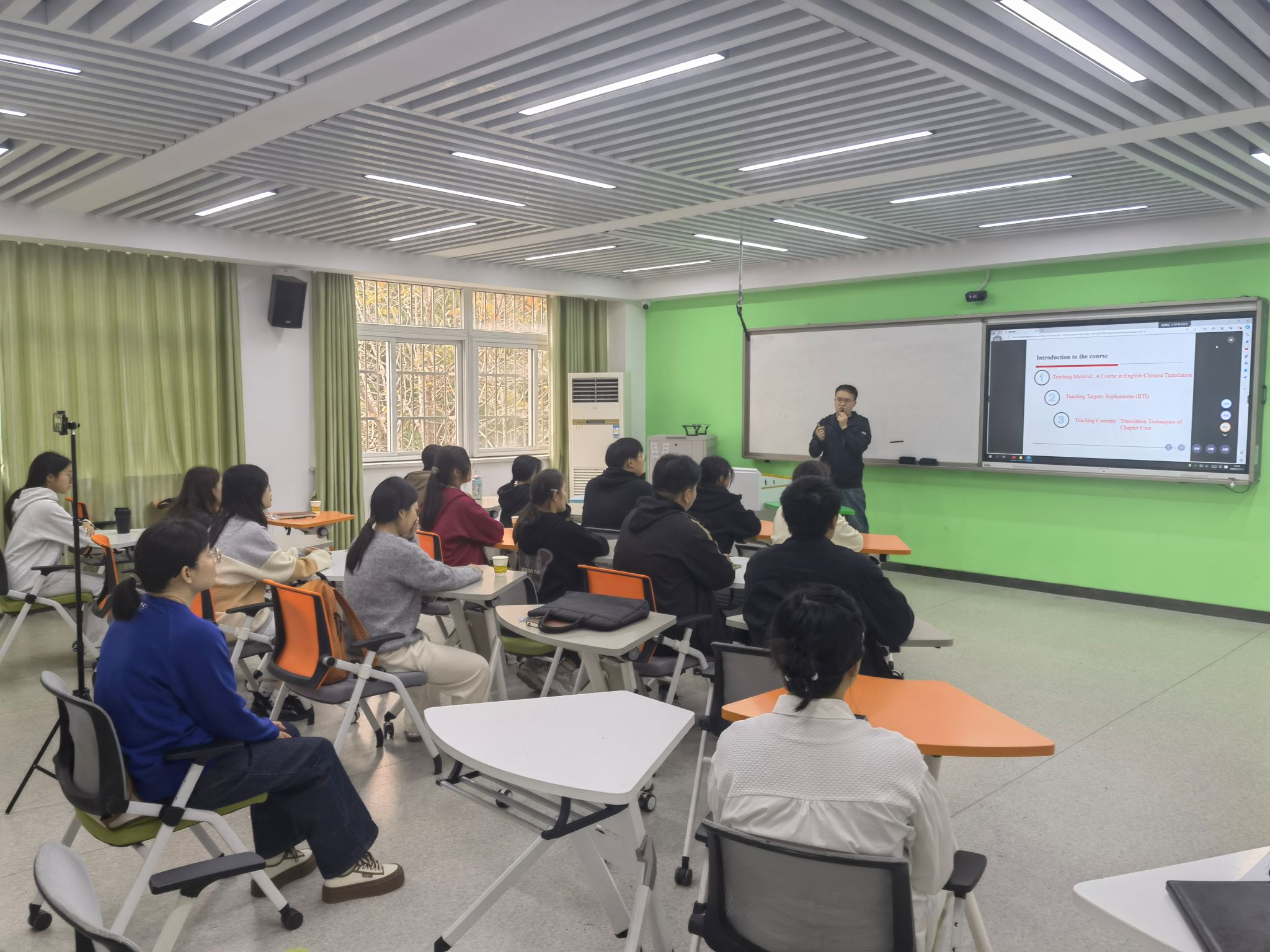 11月13日下午,外国语学院翻译教研室在求知楼B306开展期中教学研讨活动。马东东老师进行教学比赛公开课展示,翻译2024级学生和教研室全体教师参加此次教学展示和研讨活动。活动由翻译教研室主任赵景梅主持。