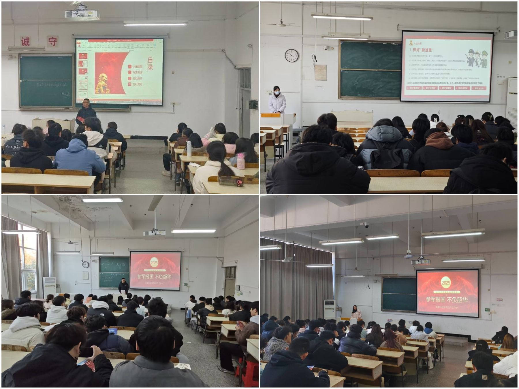 各班级辅导员讲解了大学生入伍在前途、经济、健康、阅历、政治五个方面的优待政策,就大学生退役复学后考研、就业方面优势进行了详细介绍,并通过视频和图片展示了军营生活,让同学们对征兵入伍有了更深入的了解。辅导员还深入解读了当前国家征兵程序,明确入伍条件和流程,鼓励广大适龄青年学子结合自身从军报国的意愿和个人发展需求积极报名参军,主动投身到新时代的国防建设中。