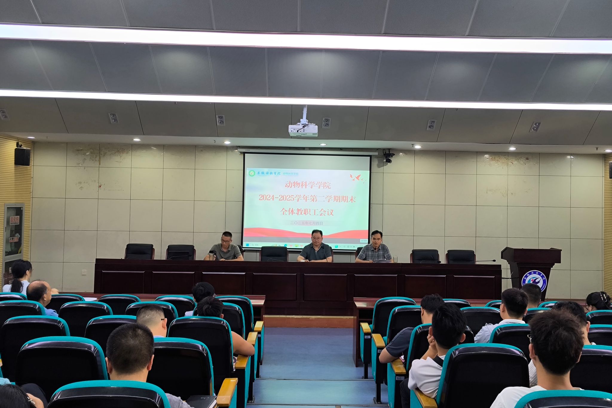 7月4日下午,动物科学学院在图书馆第一报告厅召开期末教职工大会,全体教职工参会。会议由学院党委书记甘宗平主持,全面总结本学期工作,并对暑期各项重点任务作出部署。