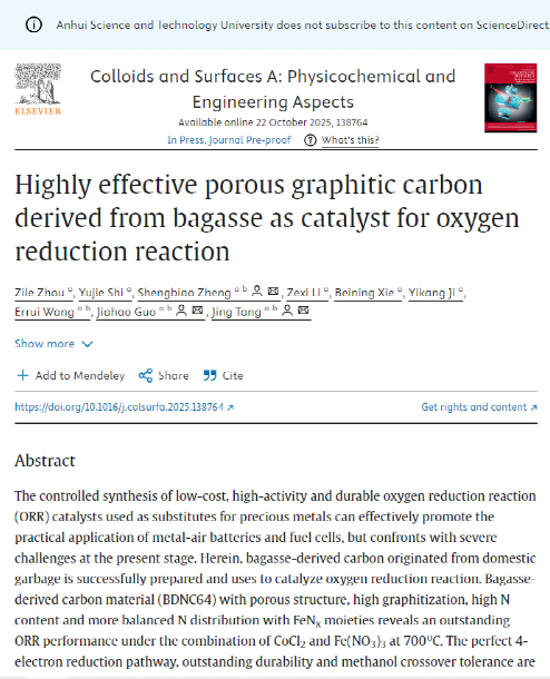 近日,我校化学与材料工程学院过家好教授实验室本科生周仔乐作为第一作者的研究成果《Highly effective porous graphitic carbon derived from bagasse as catalyst for oxygen reduction reaction》被国际化学学科期刊《Colloids and Surfaces A: Physicochemical and Engineering Aspects》(中科院二区,IF=5.4)接收。这是继2024年后过家好教授实验室连续两年指导本科生作为第一作者发表SCI论文。