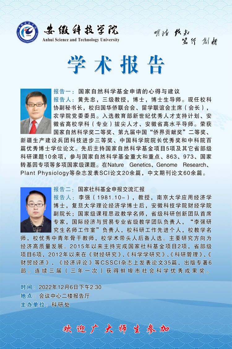 此次邀请专家为主持5项国家自然科学基金项目的黄先忠教授及2项国家社科基金项目主持人李强教授,二位专家将就国家基金申报的要点及建议开展辅导,望各学院部高度重视,积极组织申报教师积极参会。