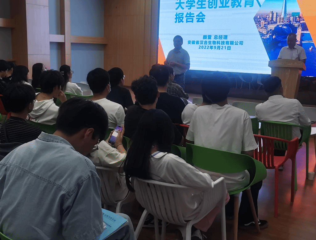 为更好地推动我校创新创业教育工作,增强同学们的创业意识和能力,9月21日下午,教务处、创新创业学院邀请安徽汉合生物科技有限公司总经理、蚌埠市“创业之星”颜雷在龙湖校区众创空间路演厅给同学们做了一场别开生面的创业辅导报告。报告会由教务处副处长、创新创业学院副院长高青海主持,来自龙湖校区六个学院的学生代表和众创空间2022年入驻团队所有成员100余名学生聆听报告。