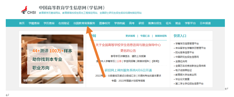 1、进入学信网官网(https://www.chsi.com.cn/),点击“出国教育背景服务”标签。
