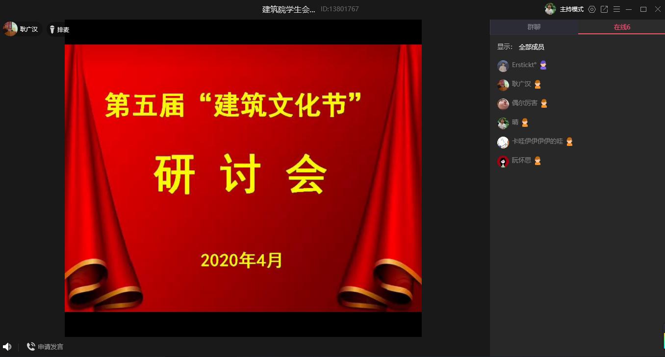 为推进第五届建筑文化节各项工作有序进行,4月3日晚上,建筑学院召开第五届建筑文化节线上专题研讨会。建筑学院团委书记耿广汉,辅导员沈德艳、阮怀思以及院学生会主席团全体成员参加会议,并对文化节的组织开展提出了一系列建设性意见。会议由耿广汉主持。