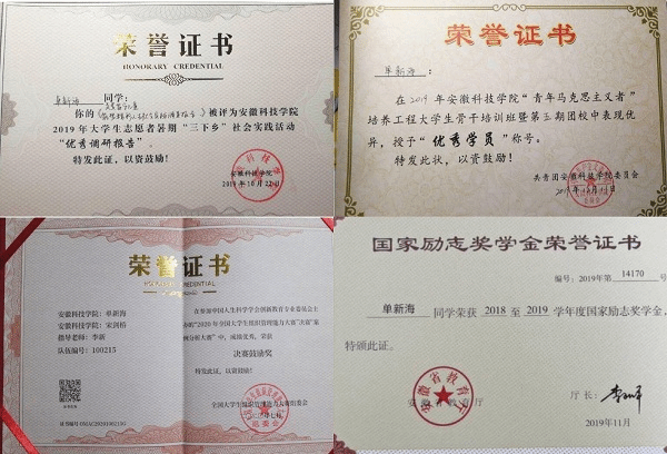 作为新时代的青年学子,单新海力求德智体美劳全面发展,大学入学至今共获得国家级奖项5项,省级奖项4项,校级奖项30项,院级奖项28项。2018年参加安徽省蚌埠市体育局招募的“言鼎华创”杯2018年全国青年游泳锦标赛志愿者工作,获得国家级志愿者荣誉称号。在中国足彩网:安徽科技学院第五期青年马克思主义者培训中,单新海表现优异,作为优秀学员代表上台发言,并被安科小团、安徽青年大学生网等多方媒体报道。自新冠肺炎疫情发生以来,单新海积极响应学校以及学院的号召,为坚决打赢疫情防控的人民战争、总体战、阻击战奉献青春力量,获评“安徽科技学院抗疫学生先进个人”荣誉称号。此外,单新海还就新冠疫情开展云调研,近万字的调研报告《蔚来智能崛起的一波三折—基于蔚来公司的社会调研与案例分析》不仅让整个团队实践效果突出,同时也获2020年全国大学生组织管理能力大赛决赛奖项,并收到主办方致蔚来的推荐信。单新海基于新冠疫情申报的大学生创新创业训练项目更是获得国家级立项,相关事迹被安科小团公众号、安徽科技学院校园网报道。2020年9月,单新海被学校推选参加省级三下乡优秀实践个人、省级三下乡优秀调研报告的评选活动。