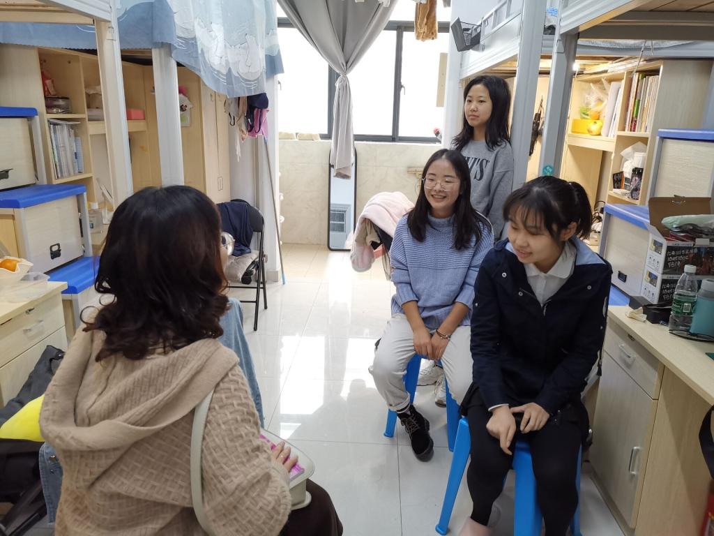 辅导员在宿舍召开座谈会,与学生亲切交谈,围绕宿舍安全、文化建设、学风建设、班级建设等话题展开讨论,并及时根据同学们反映的问题,沟通协调,及时解决。