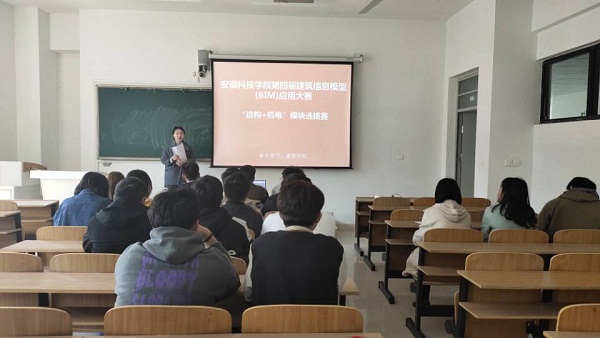 3月17日至3月25日,由教务处主办,建筑学院承办的安徽科技学院第四届建筑信息模型(BIM)应用大赛在龙湖校区顺利举行。经过层层筛选,本次竞赛共有15组队伍进入决赛。建筑学院专业课教师吴伟东、于敏、杨瑞敏、肖昕迪、马露、曹稳、徐晓阳、韩意、程希莹、袁玲等出席决赛现场并对参赛小组进行指导。