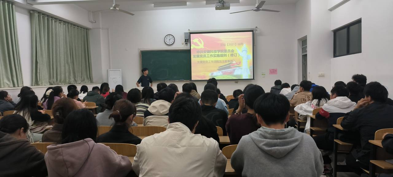 会上,李庆龙首先带领大家学习了党组[2021] 58号《中共安徽科技学院委员会发展党员工作实施细则(修订)》文件中的具体内容,图文并茂地介绍了中国共产党的基本情况、党章党规以及入党流程,帮助入党积极分子了解党员发展工作程序和党员发展质量要求。接着李庆龙通报了第59期党校培训班学员的学习进度,希望在座学员能够珍惜此次培训学习机会,严格遵守培训相关要求,按时完成每一模块的学习与考试,以优异的成绩完成党校学习培训任务。