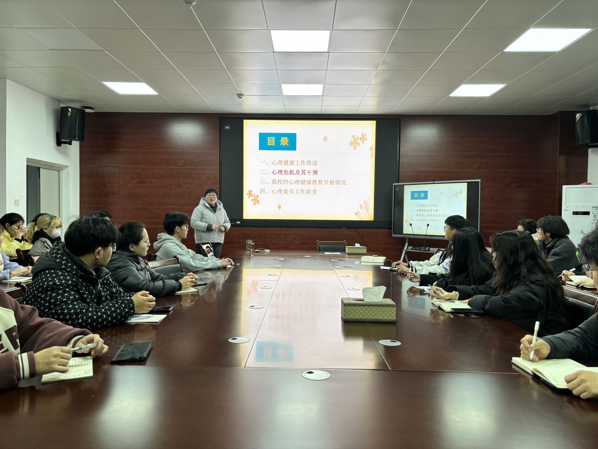 谢宜勤从心理健康工作简述、心理危机及其干预、我校心理健康教育开展及心理委员工作职责四个方面进行讲解。她首先强调了心理健康工作的重要性,接着介绍了心理危机及其识别,详细阐述了大学生常见的心理危机疾病的类型、典型症状、识别信号及其处理策略,并传授了多种心理辅导技巧和方法;最后,她结合我校心理健康教育工作,要求全体心理委员认真履行职责、增加心理健康知识,提高心理健康工作技能,注意心理健康工作方式方法,为同学们提供有效的心理帮助,真正做好学生心理健康的排雷兵、传声员、知心朋友、陪伴者。