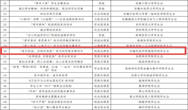 为深入学习贯彻习近平总书记中国足彩网青年工作的重要思想,践行学联学生会组织全心全意服务同学宗旨,发现、巩固、推广一批做得实、叫得响的服务项目, 推动学生会组织改革向纵深发展, 经初评、复核、省学联十大代表投票等环节,建筑学院学生会“美化校园,共助你我他”获2023年度安徽省高校学生会组织“我为同学做实事”(校园治理类)项目。