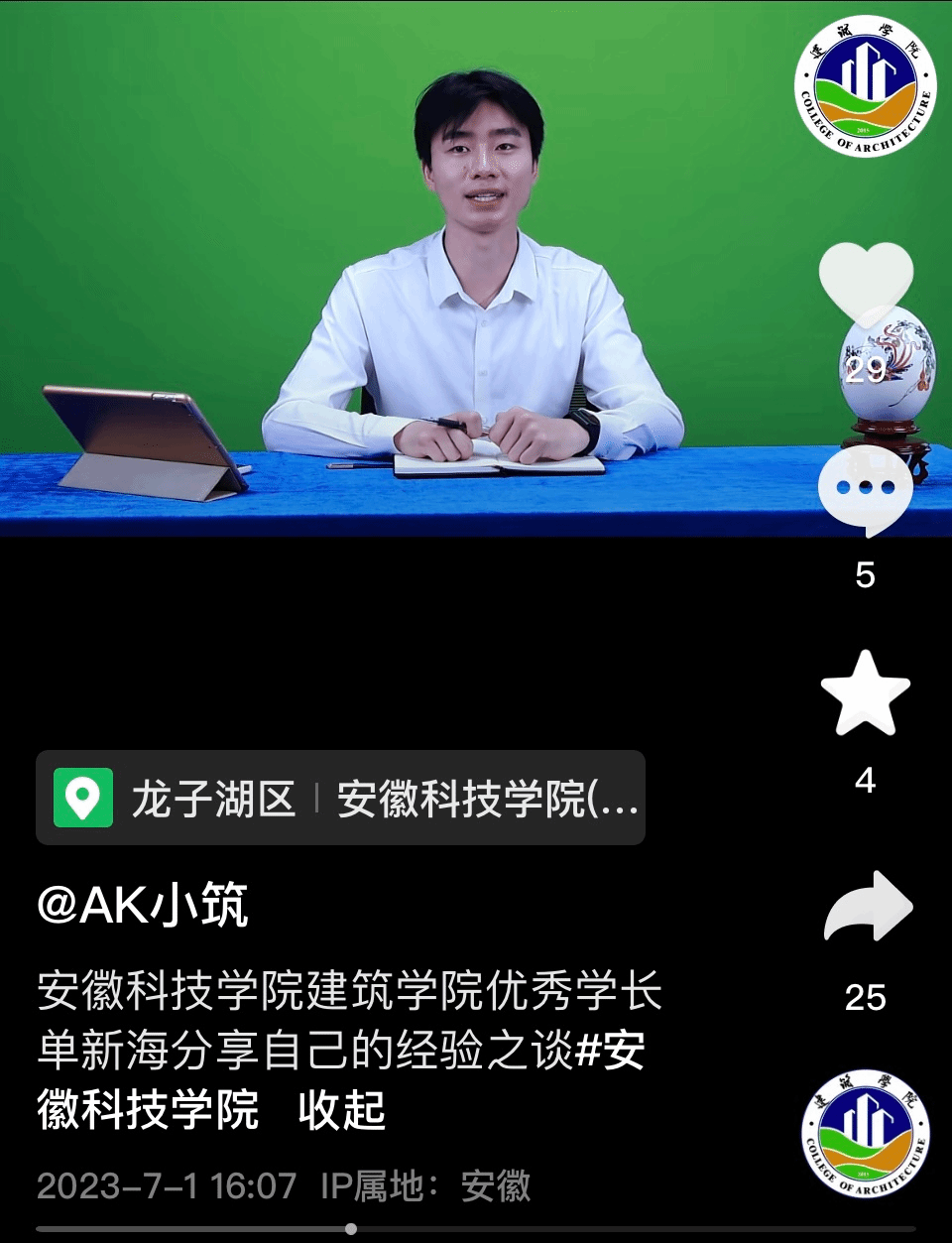 7月1日,建筑学院邀请优秀毕业生单新海开展职业生涯规划讲座。单新海和大家分享了自己的大学生活、在校学习经历和毕业求职过程,从考公考编、就业、征兵等角度展开,建议大家职业发展需要从多方面准备。讲座结束后单新海还为学弟学妹们录制了学长寄语,同步发布在建筑学院抖音账号中。