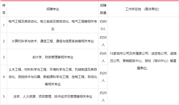 安徽公司第一批次招聘单位包括合肥、芜湖等16家地市供电公司(含所属县公司)和相关直属单位,主要安排在市、县供电公司生产一线岗位和直属单位专业技术、技能岗位等。专业需求信息如下(均指主修专业,不包含第二学位):