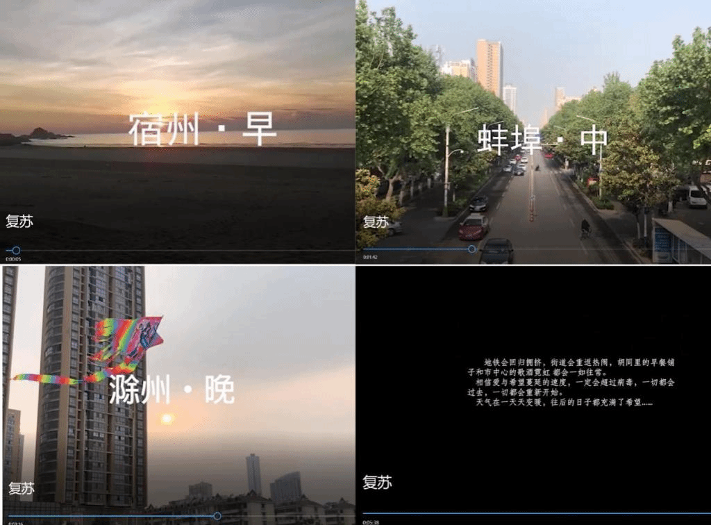 三位同学分别在所在家乡——宿州、蚌埠和滁州,用手机记录下非常时期下各类人群的生活、故事,“抗疫”中的感人事迹以及后疫情时代家乡建设情况,传递积极力量,坚定抗击疫情的必胜信念,最终剪辑制作成微视频《复苏》。