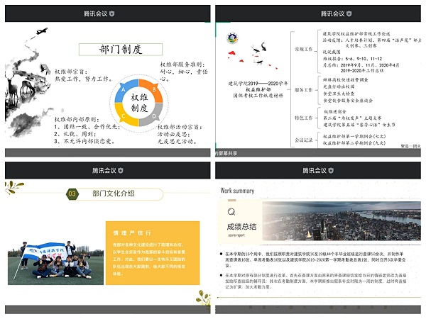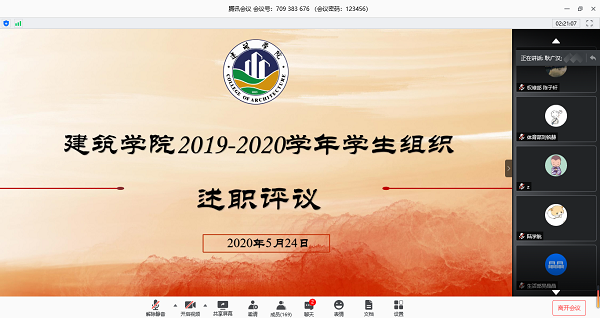 为深入学习贯彻习近平新时代中国特色社会主义思想和党的十九届四中全会精神,推进学生组织工作规范化、民主化、公开化,建筑学院学生会于5月24日上午九点在腾讯会议开展了2019-2020学年学生组织述职评议会议。建筑学院分团委书记耿广汉、建筑学院辅导员沈德艳、靳盼、阮怀思、建筑学院第四届学生会主席梁朝中观摩并对工作进行了现场评议。