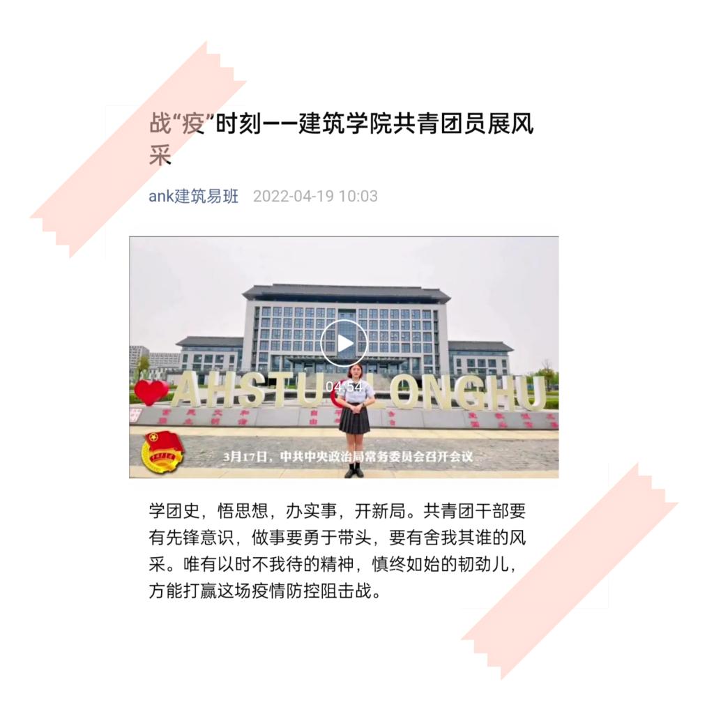 团支部录制的《战“疫”——共青团员的中坚》视频,充分体现了广大团员青年在疫情防控阻击战中贡献青春力量的热情和决心。视频中,张雨欣同学就当下疫情形势进行了系统地讲解,她号召全体共青团员要发挥党的助手和后备军作用,带领班级学生积极作为。罗志娟同学讲述了疫情防控期间建筑学院学子积极参加劳动实践、体育锻炼和文化活动,号召广大青年继续争当表率,以实际行动坚定战胜疫情的决心和勇气。该视频在安徽科技学院建筑学院易班微信平台发布后,反响良好,得到师生一致好评。
