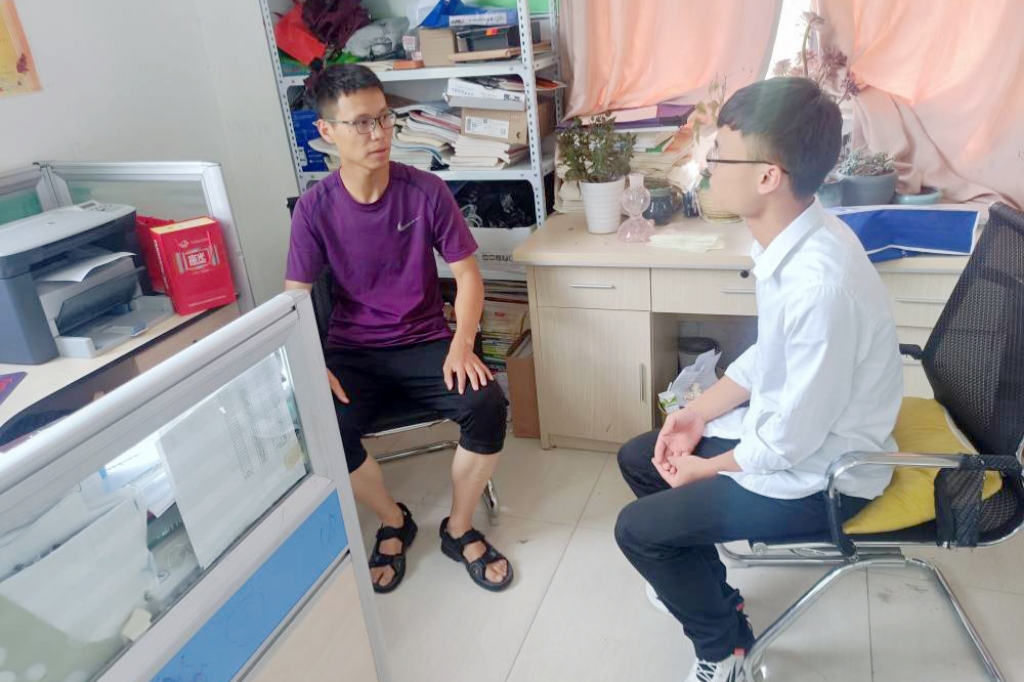 到达校园后,王健伟团队拜访了高三班主任崔猛老师和高中生物老师王乐潇。王健伟向老师说明了此次实践的主要目的和内容,介绍了安徽科技学院的相关情况。在了解团队此行目的之后,崔老师、王老师非常热情地组织了部分高三返校生开展学习交流。