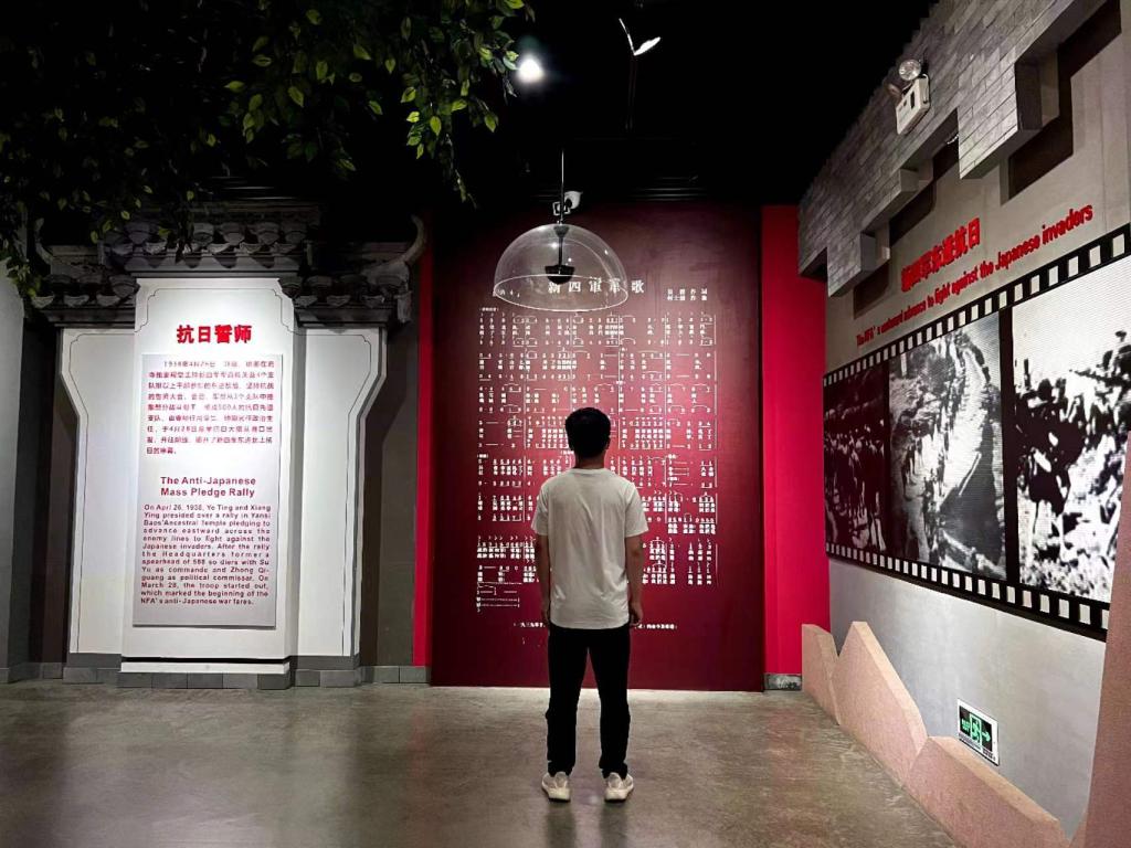 岩寺新四军军部旧址纪念馆主体由序厅、图片展览厅、实物陈列厅、放映厅组成,外部军部广场的最西端有新四军领导人叶挺、项英、张云逸、袁国平、周子昆、邓子恢6人的雕塑像,通过讲解,团队成员学习到了六位革命先烈的峥嵘革命史,体会到了艰苦奋斗、矢志不渝的革命精神。