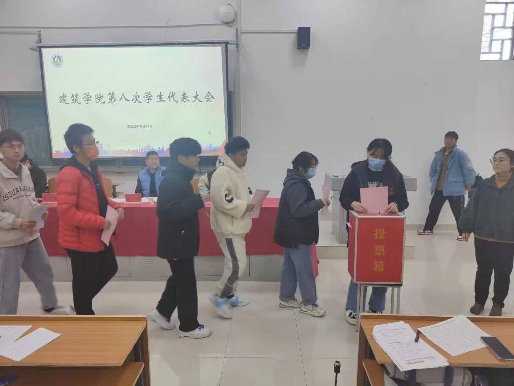大会在庄严的国歌声中拉开序幕。首先由建筑学院第七届学生会执行主席孙玉慧做工作报告。报告阐述了学生会各部门职责,回顾了院学生组织过去一年里的各项工作情况,并且指出了学生组织当前面临的新形势新挑战,同时也祝愿新一届学生组织工作越来越好。随后,大会表决通过了《建筑学院第八届学生委员会委员选举办法(草案)》和《建筑学院第八次学生代表大会总监票人、监票人建议名单(草案)》,选举产生了出席安徽科技学院第十五次学生代表大会正式代表、建筑学院第八届学生会主席团成员、建筑学院第八届学生委员会委员。