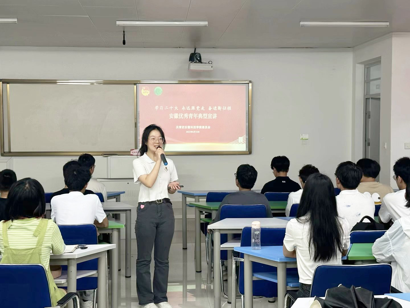 为充分发挥青年典型模范带头作用,营造学习安徽省各级青年五四奖章、“两红两优”等优秀青年典型事迹浓厚氛围,进一步组织引导青年学生将党史团史理论学习与社会实践相结合,推动党的二十大精神、团的十九大精神进校园,6月16日至6月19日,安徽科技学院建筑学院“筑梦青年”院级重点宣讲团在校团委的统筹安排和建筑学院教师的专业指导下,按照全覆盖、广领域、多渠道的要求开展两场“学习二十大 永远跟党走 奋进新征程”宣讲活动。活动覆盖建筑学院青马学员、党员、入党积极分子、入团积极分子、受资助大学生等百余人。