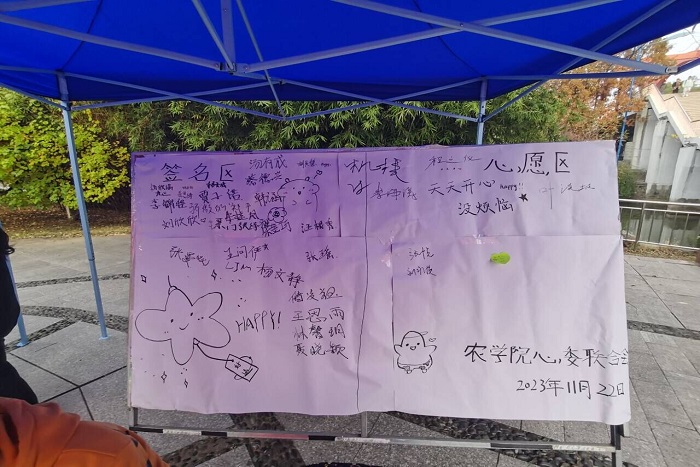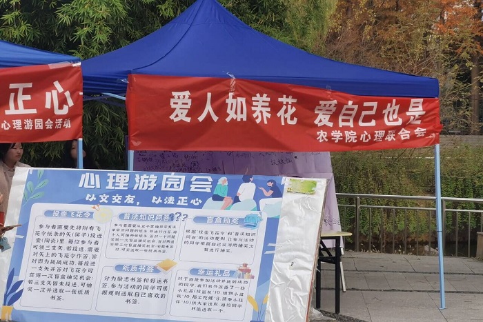11月22日,为了进一步普及心理健康知识,农学院积极响应学校开展的“12?15大学生心理健康月活动”的精神,在西区广场举办了以“爱人如养花,爱自己也是”为主题的心理健康活动。
