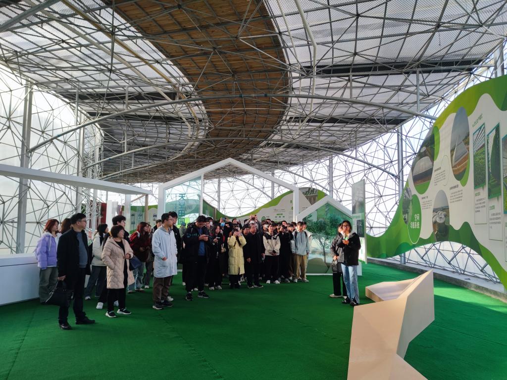 园区经理沈旭热情接待了农学院师生,并向大家介绍了太空农场的建设理念、规模、种植模式及发展思路等。同学们在工作人员的带领下参观了土楼形科普体验温室、金字塔形科技展示温室、以及鸟巢形植物工厂温室等现代化农业设施及智能化栽培管理模式。