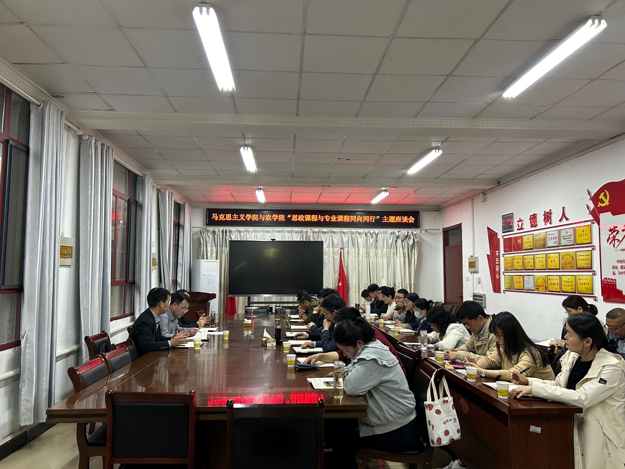 为贯彻落实习近平总书记在学校思想政治理论课教师座谈会上的重要讲话精神以及全国高校思想政治工作会议精神,推进思政课程与课程思政深度融合,实现思政工作与人才培养有机融合、形成同向同行协同效应,4月29日上午,马克思主义学院与校内学院结对共建的“思政课程与专业课程同向同行”主题座谈会在农学院会议室召开。教务处处长赵伟峰,马克思主义学院党总支书记杨仕勇,党总支副书记、院长张德化,农学院党政领导,两个学院的系(中心)主任、教师代表参加,座谈会由农学院党委书记何世潮主持。
