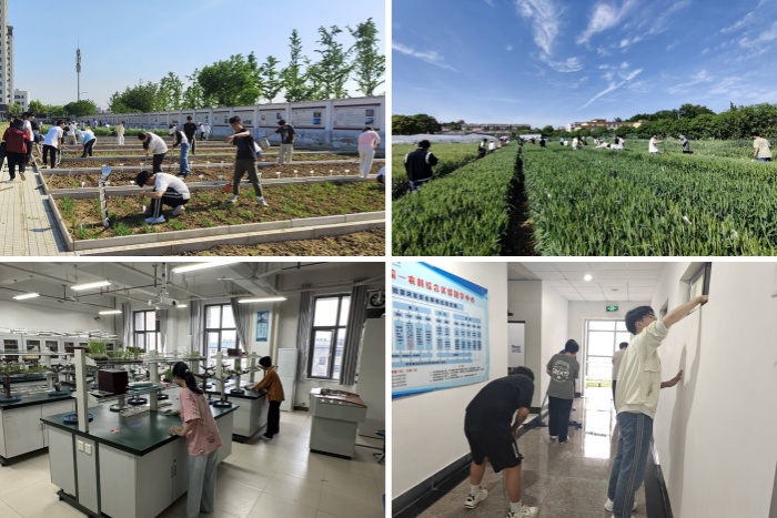 结合专业实际,夯实劳动实践。学院采用专业实践性劳动、日常生活性劳动和志愿服务性劳动相结合的模式,引导和组织学生广泛参与劳动体验,激励学生弘扬劳动品德、培养劳动技能、磨砺奋斗品格。5月8日-5月9日,农学院组织了别开生面的田间劳动活动。5月10日,农学院在躬行楼三号、四号楼部分楼层,开展了一场实验室打扫实践活动。