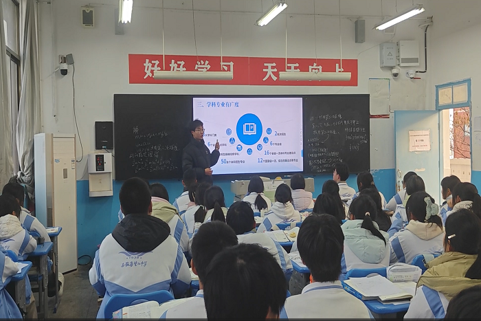 活动当天,在老师的引领下,团队成员走进班级,开展宣讲活动。他们借助PPT和招生宣传片,全方位地介绍了安徽科技学院。生动详实的讲解,让学弟学妹们对安科充满了向往与期待。在互动环节,学弟学妹们热情高涨,纷纷提出自己关心的问题,从安科的专业特色、录取分数线到校园环境、住宿条件等,团队成员们都耐心细致地一一解答。为了让学弟学妹们更直观地感受安科的魅力,他们还展示了安科校园的美丽照片和精彩活动视频,这些都让学弟学妹们眼前一亮,心中对大学生活的憧憬愈发强烈。