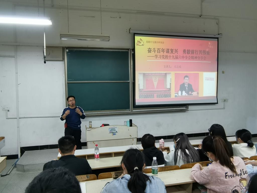 为深入学习贯彻落实党的十九届六中全会精神,扎实推进思政课教师和辅导员两支队伍结对共建、协同育人,不断提高人才培养质量。5月14日下午,农学院在求知楼A103组织开展党的十九届六中全会精神专题党课宣讲会。学校党委学工部、学生处秘书石志成老师应邀主讲,农学院第56期全体入党积极分子参加,宣讲会由种子与植保专业学生党支部书记汪道兵主持。