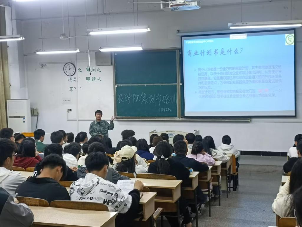11月2日,农学院于求知楼A101举办创新创业计划书撰写培训会。农学院2022级新生100余人参加培训,农学院金禾创新创业中心主席刘锡瑞担任主讲。