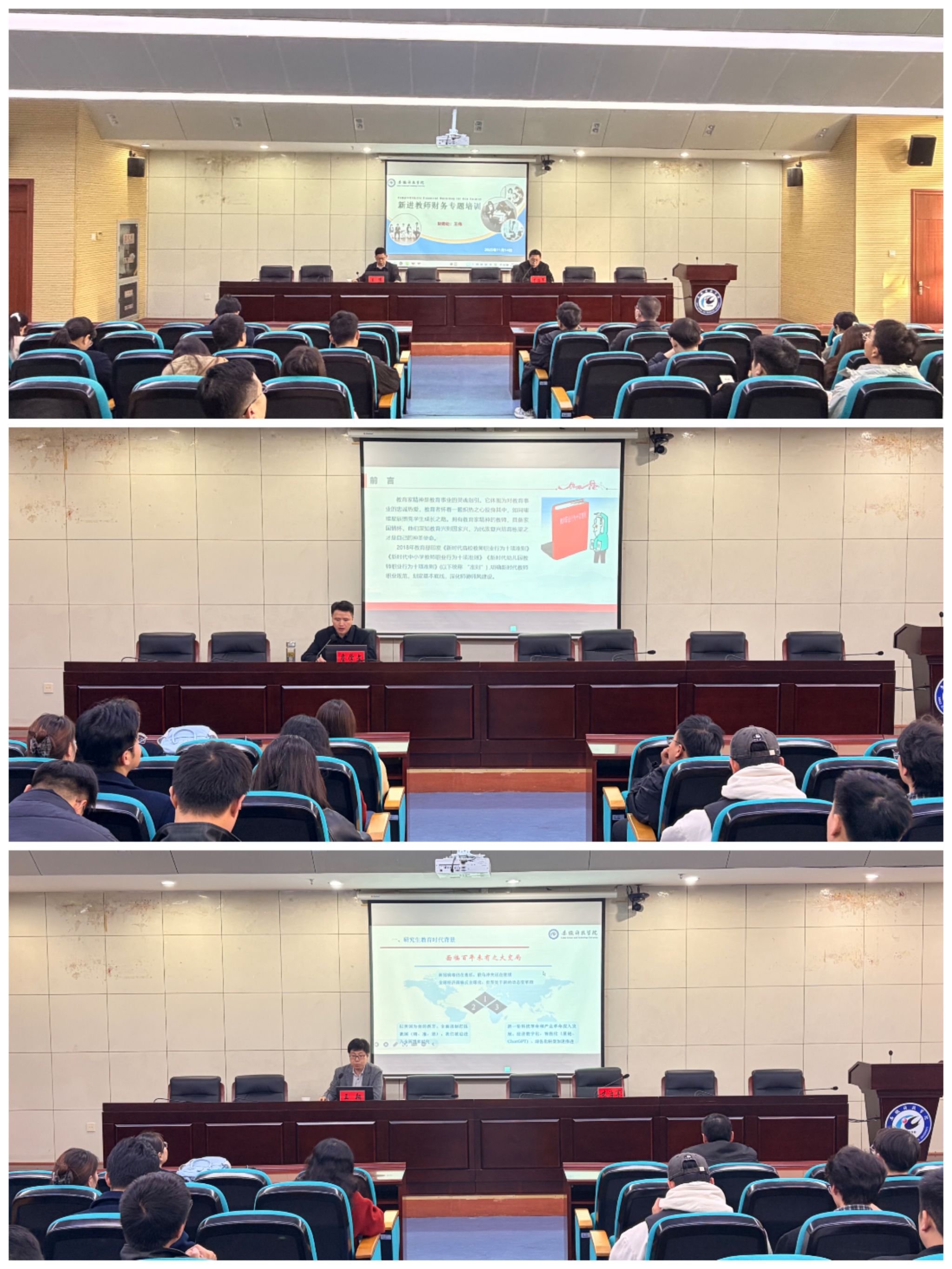11月13日至14日,学校在凤阳校区一楼报告厅举行2025年新进教师岗前培训专题辅导会,生物医学与健康学院马玉涵副教授、科研处处长陈丰、教务处副处长舒英杰(主持工作)、纪委办公室主任张开宝、财务处处长王伟、人事处处长詹学文和研究生处学科建设与学位管理科科长王翔应邀为新进教师作专题辅导报告。2025年全体新进教师参加报告会,报告会由人事处师资科科长才治军主持。